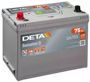 Battery Brand: DETA Battery Code: DA755 Voltage: 12 V Battery Capacity: 75 AH Height: 222 Width: 173 Length: 270 Cold Cranking Amps (CCA): 630 A Post Positions: 1 Terminal Type: EN Hold-down Type: Korean B1 | |